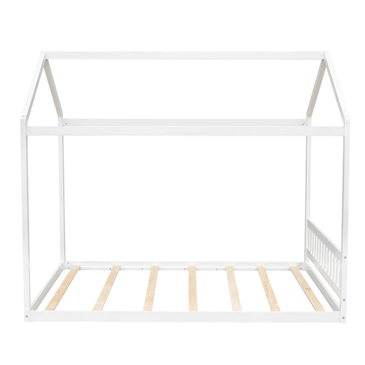 Wood House-Shaped Floor Bed With Fence, Guardrails