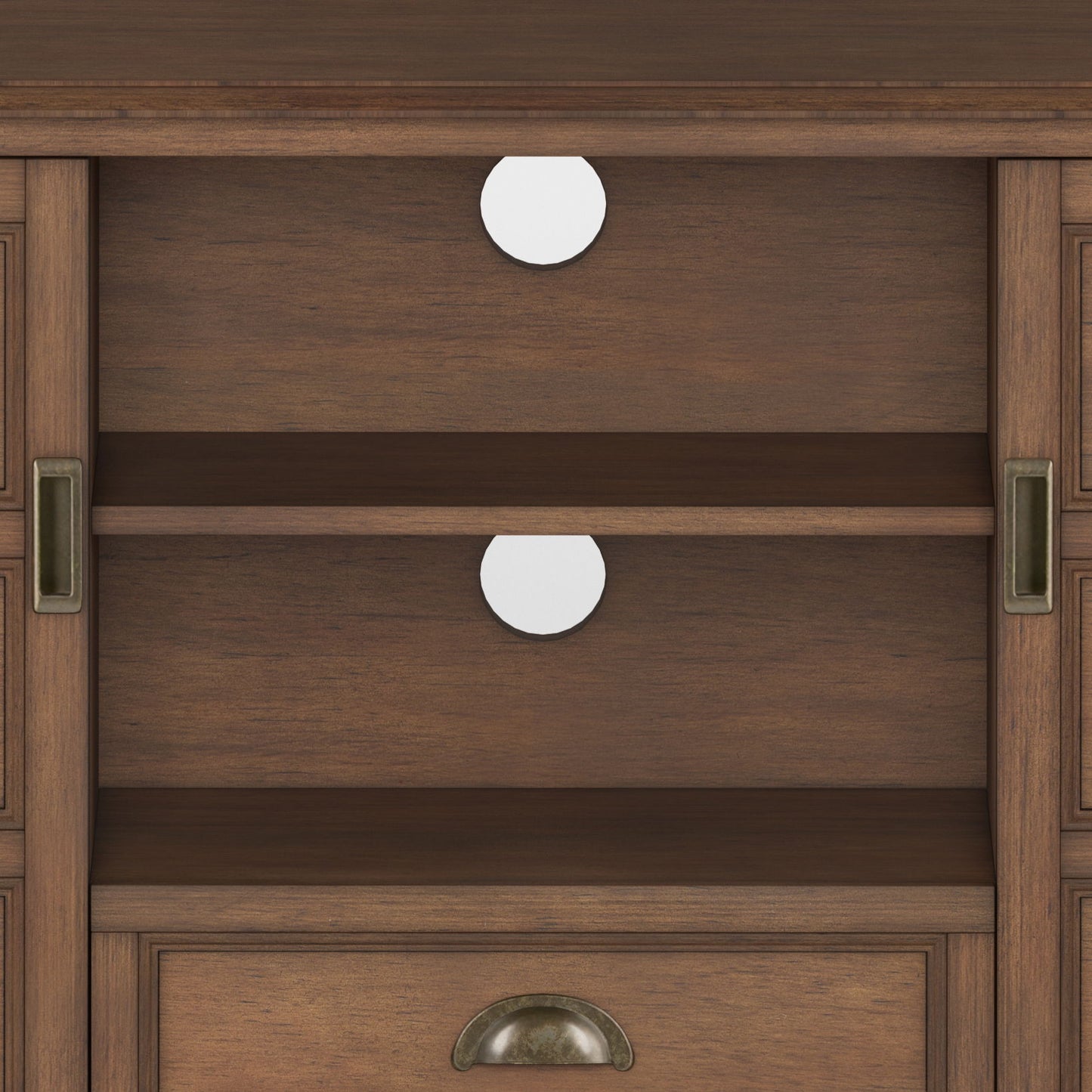 - Features two (2) central drawers with metal glides, open center area with adjustable shelf and two (2) side doors that open to large storage spaces with two (2) shelves each