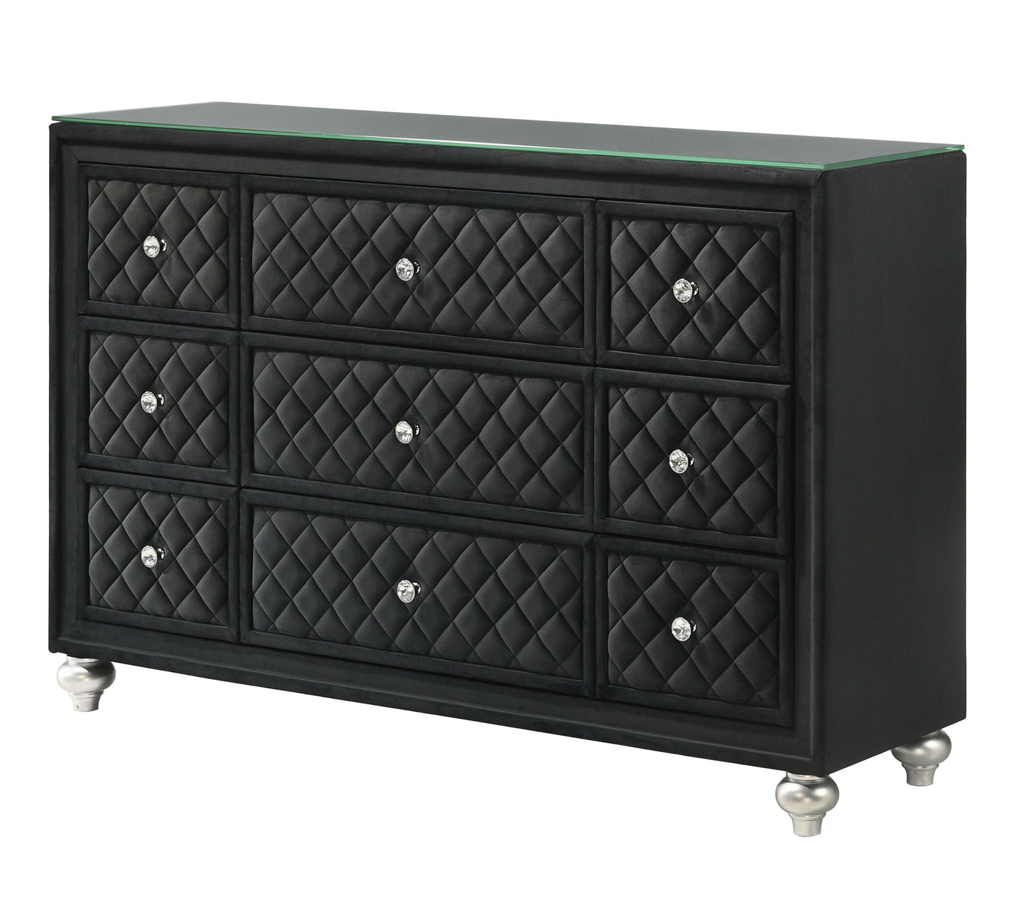 Indulge in timeless elegance and dramatic sophistication with this stunning bedroom collection, designed to make a bold statement. The centerpiece features an exquisitely tufted headboard with luxurious upholstery and intricate nailhead trim, exuding opulence and grandeur. Coordinating pieces showcase diamond-patterned tufted accents, mirrored details, and polished hardware, blending classic design with modern glamour. With ample storage and impeccable craftsmanship, this ensemble offers both style and practicality, creating a lavish retreat that embodies refined comfort and striking aesthetics. Perfect for those seeking a bedroom that radiates luxury and charm.