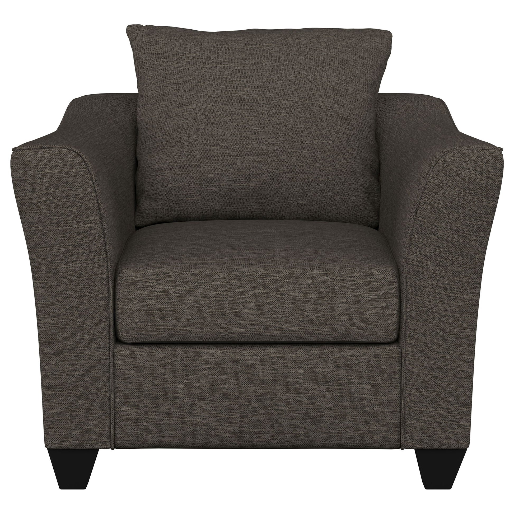 Beautifully styled, this chair fits in with a variety of seating ensembles. Flatter a contemporary space with a contoured silhouette. Flared arms add a chic touch. Wrapped in warm grey upholstery, it delivers a stylish updated palette. Make this chair a favorite venue for reading or watching TV.